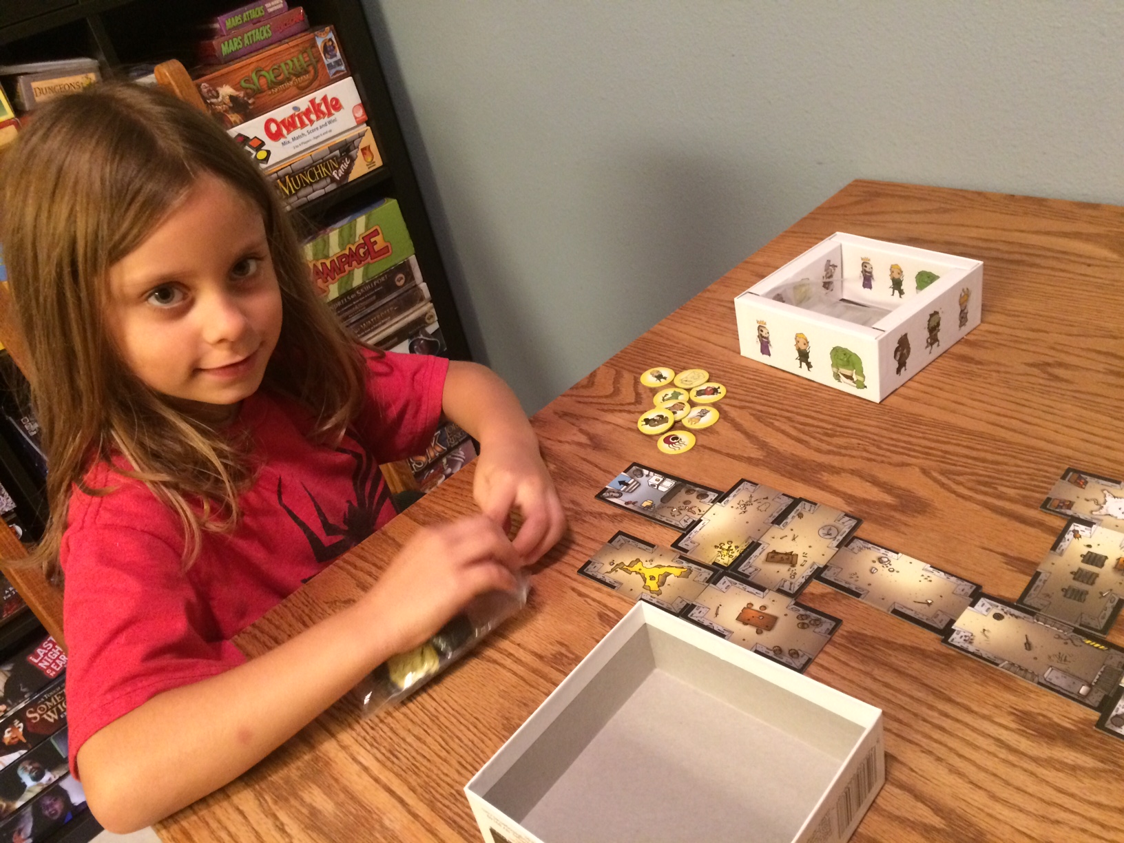 This is a game I had wanted to try for a while but I was reluctant to purchase it because I wasn’t sure if I would play it on a regular basis. However I was able to pick it up for a reduced price at the Barnes & Noble Red Dot Sale and I have to say it exceeded my expectations, especially with my own Player 3 at home. When setting up the game I dumped out all of the room tiles and let the little one build her very own dungeon. A simple step in the game that really made it shine. The tiles have excellent art on them and Player 3 really enjoyed mixing and matching the pieces by length and width to create a truly unique dungeon experience each round. Once the dungeon was set up I placed the entrance and treasure room insuring they were the farthest away from each other and we moved on to character placement.