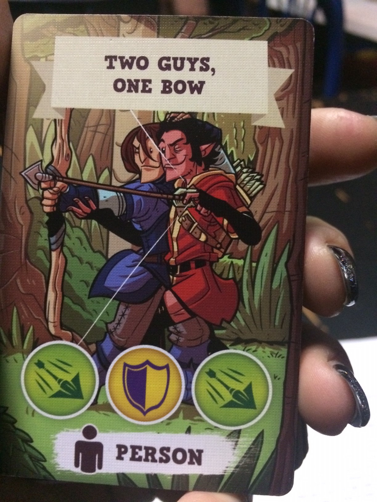 Game play was incredibly simple to learn. You basically run through your deck of cards and try to match symbols with other players to defeat the fantastically creative bosses like the “Two Guys, One Bow” but you have to be careful not to run out of cards or else your 5 minute dungeon crawl would become a story of epic failure. However, that’s not the only threat in the game, this dungeon adventure runs on real time and your 5 minutes monster stomping will end much faster than you think. After playing my first round with a bunch of newbies and one veteran, we beat the easiest boss with a mere 30 seconds to spare.