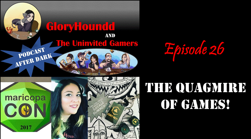 Join GloryHoundd and The Uninvited Gamers “After Dark” at Games U as they talk about Werewords and update you on the local conventions. The Uninvited Gamers will also be helping you navigate the Kickstarter gauntlet by breaking down The Brigade and Gameception. Meanwhile shenanigans brew as the Uninvited Gamers figure out who the Quagmire of Games is!